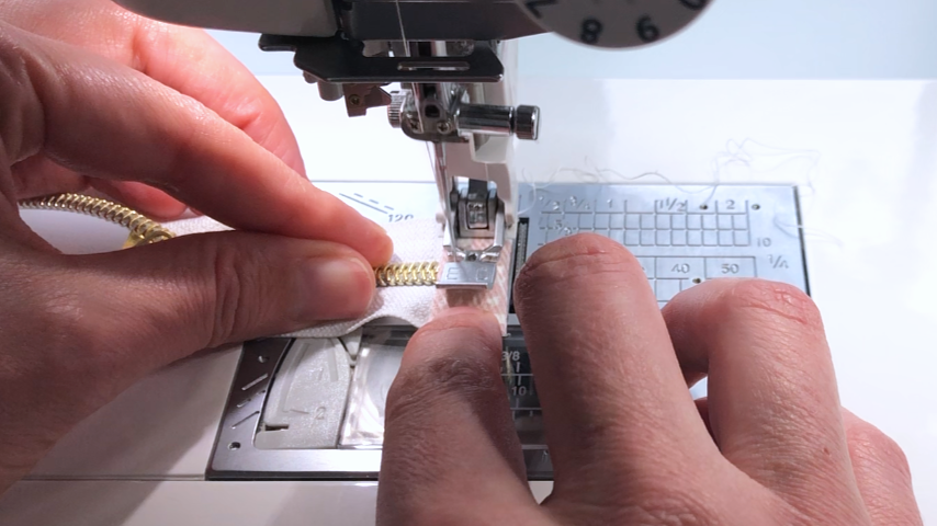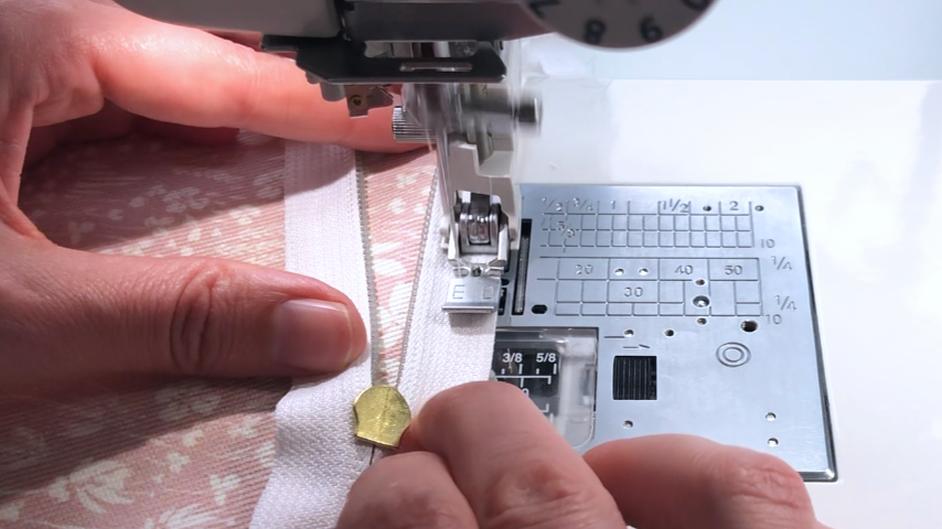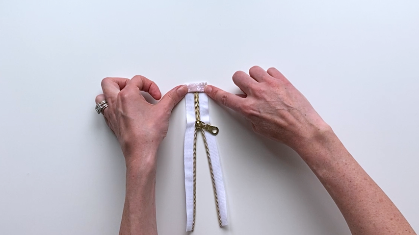 Put the closed end of the zipper into the center of that folded tab and topstitch into place.