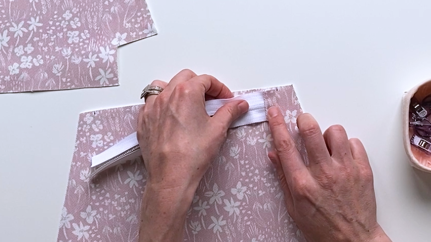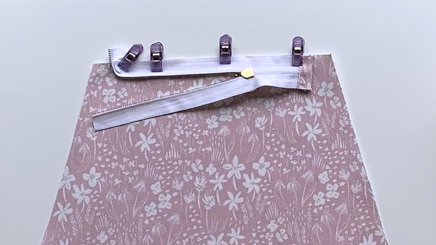 Clip the zipper into place (right side of the zipper placed on the right side of the outer panel), and on the open end of the zipper, fold the zipper at a 90-degree angle so that the zipper teeth end right before the mark.