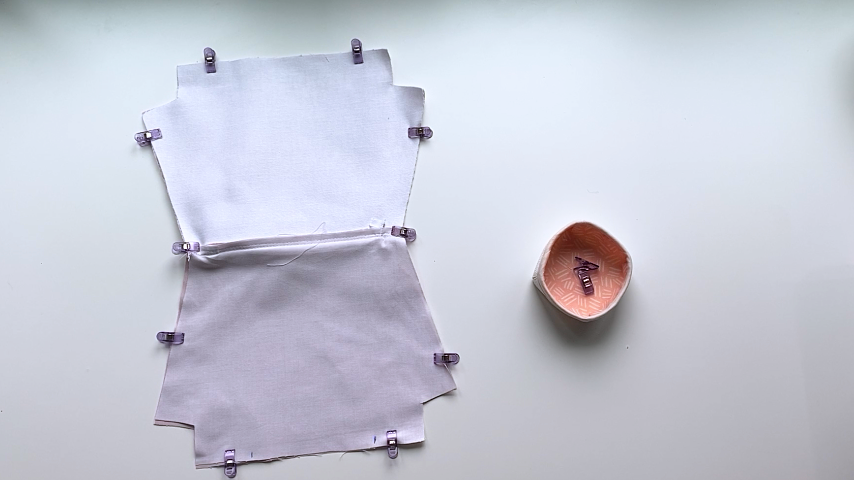 Open the corners and line up the seams (side seam and bottom seam) and clip the corners into place so the top edges line up.