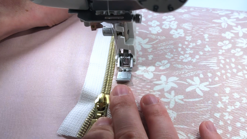 Place the lining right sides together with the outer piece, lining up the top and side edges and clip into place. Then sew into place, using a zipper foot to sew close to the zipper teeth. You may also need to use a hump-jumper to sew over the start and end of the zipper.