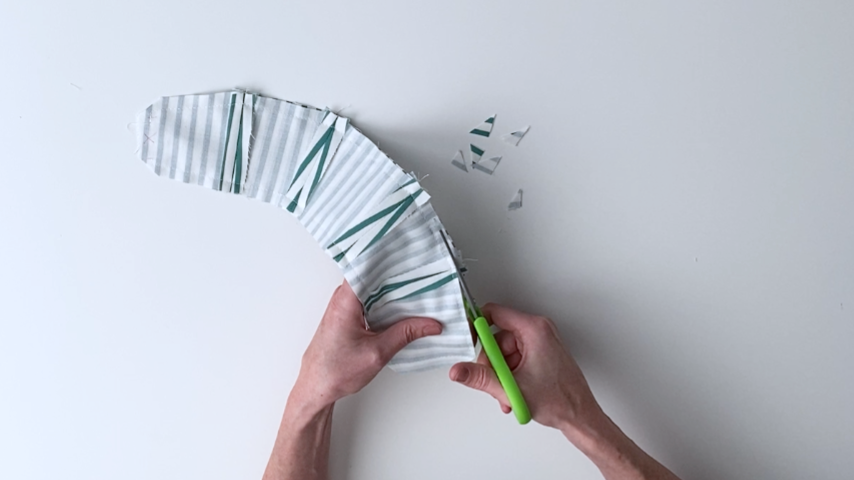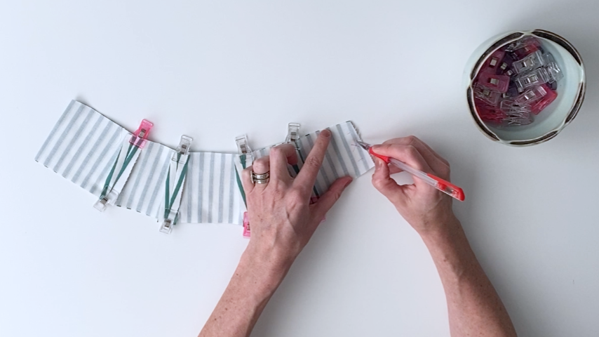 Clip each corner and the seam allowance around each edge (except for the end with the opening), cutting 1/4″ away from your stitching.
