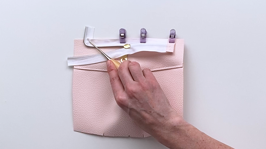 Clip the zipper into place (right side of the zipper placed on the right side of the top panel), and on the open end of the zipper, fold the zipper at a 90-degree angle so that the zipper teeth end right before the mark.