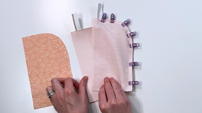 Then clip your lining into place, so the lining and outer piece are right sides together with the zipper sandwiched in between.