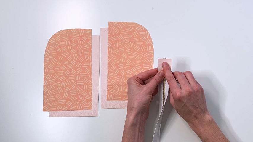 Place your zipper and outer piece right sides together and clip the zipper tab into place so it starts just after your 5/8” mark.