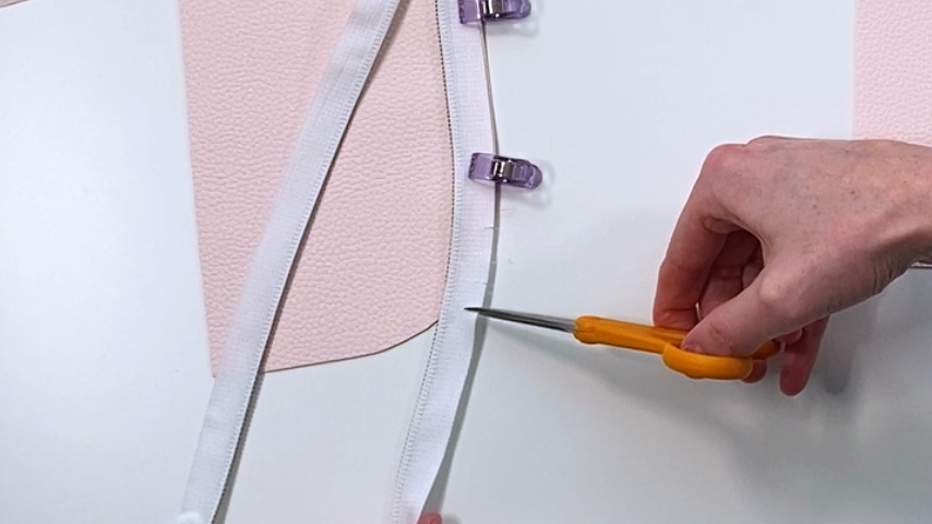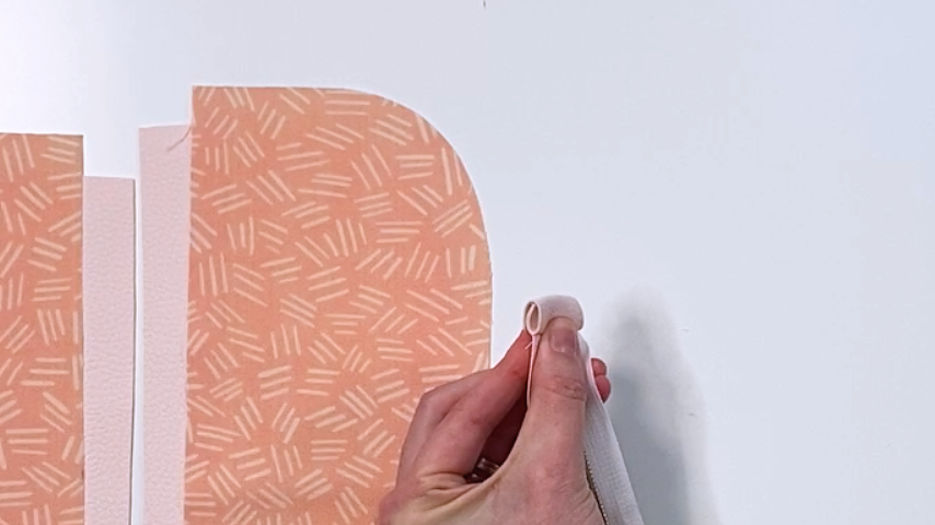 Continue clipping the zipper to the exterior piece and as you get to the curve, clip your zipper tape about 1/8” or up to the reinforcement line (You’ll notice a line on the zipper tape that runs parallel to your zipper, it’s subtle. That’s the reinforcement line and it will prevent your fabric from fraying beyond it if you add snips.)