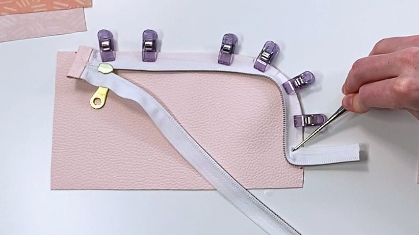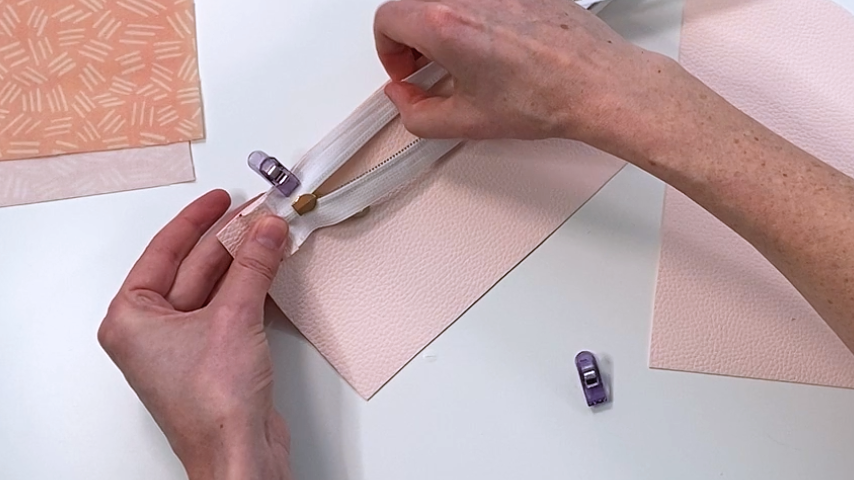 As you get to the open end of your zipper, fold your zipper at a 90-degree angle so the teeth of the zipper end right before your 5/8” line and clip into place.